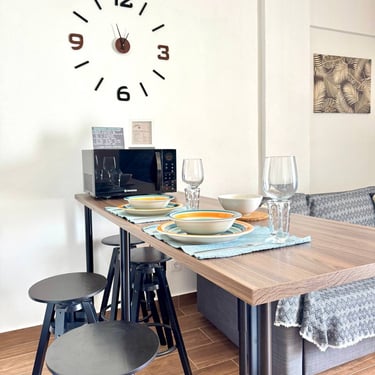 Gli interni, dallo stile contemporaneo e dalle tonalità calde, trasmettono un senso di equilibrio e comfort. Il soggiorno luminoso accoglie una zona pranzo con tavolo e TV, ideale per rilassarsi dopo una giornata di esplorazione.