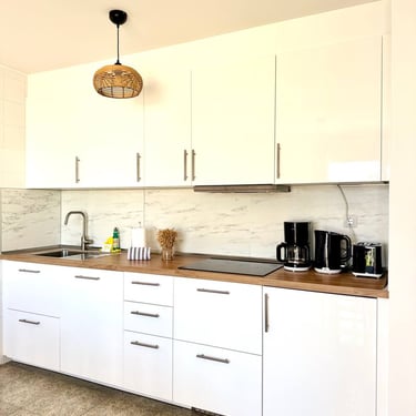 La zona giorno offre un comodo divano e un tavolo da pranzo perfetto per due persone, mentre la cucina è dotata di piano cottura, frigorifero, macchina del caffè, bollitore e tostapane, per vivere un soggiorno indipendente e confortevole.